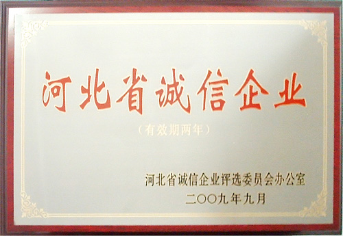 2009年9月,我公司被河北省誠信企業評選委員會評為“河北省誠信企業”,并被收入《河北誠信企業建設成果集》。證書及獎牌于近日發放到公司。