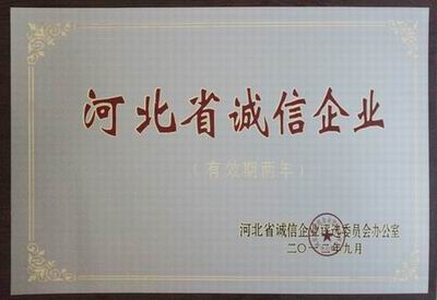 2012年9月26日上午,在河北省石家莊市召開了2012年“河北省企業(yè)誠信建設經驗交流會”暨“河北省誠信企業(yè)”授牌儀式。我公司被評為2012年“河北省誠信企業(yè)”,公司董事長、總經理王振剛被評為“河北省企業(yè)誠信建設優(yōu)秀工作者”。河北省整頓和規(guī)范市場經濟秩序領導小組辦公室、河北省誠信企業(yè)評選委員辦公室、河北省企業(yè)家協(xié)會聯(lián)合對獲獎企業(yè)予以表彰,并頒發(fā)了證書。誠信是企業(yè)生存的根本,誠信是企業(yè)發(fā)展的法寶。